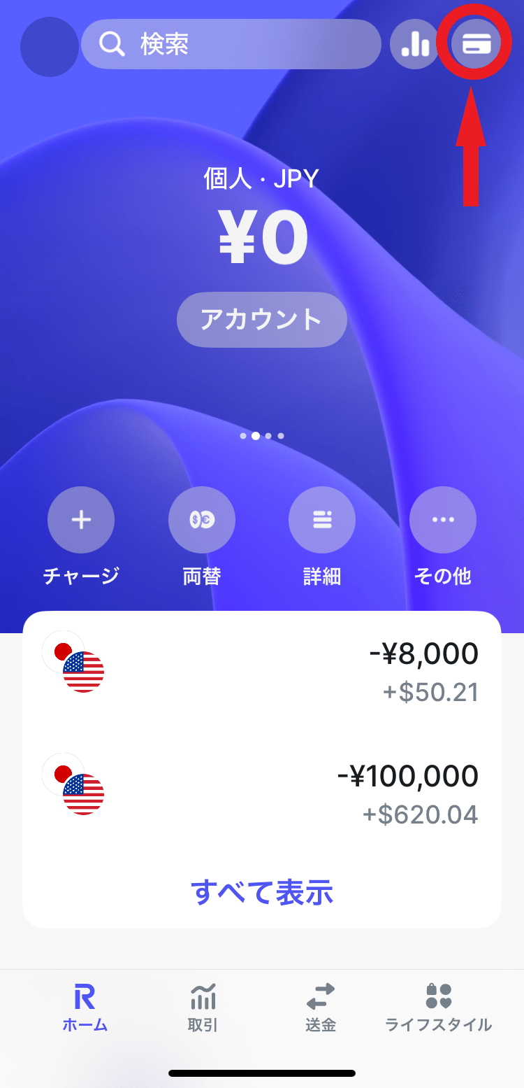 ⓵アプリを開いて右上のカードマークをタップ。