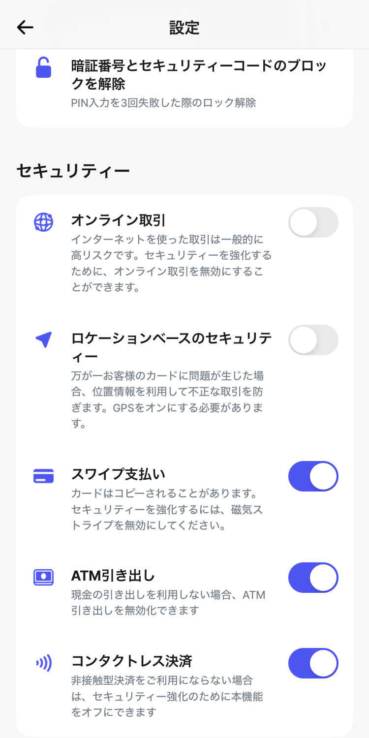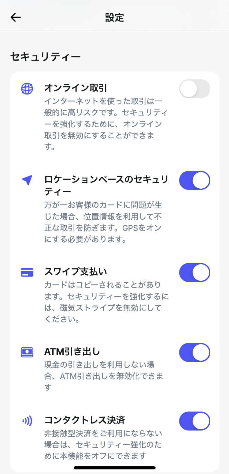 「オンライン取引」は、現地でレストランやツアーなど、オンライン予約等する時だけONにして、それ以外の時は、必ずOFFにしておく事をおススメします。