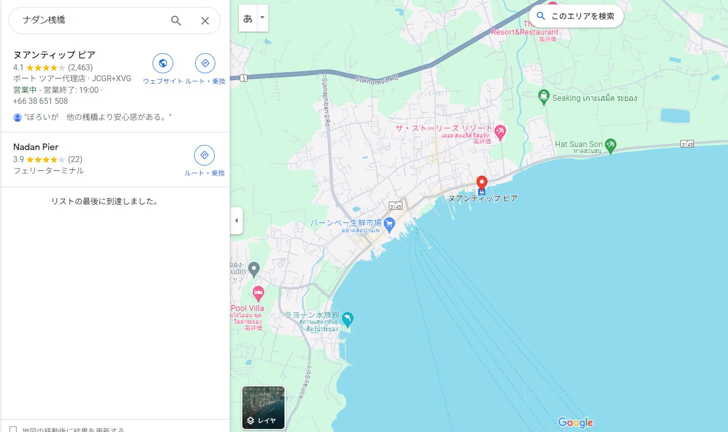 バスターミナルや12goでは、バンコク→バンペー+サメット島と表記されていて、Googleマップでは、ピアがいくつかあるので、どこに到着するのか謎でしたが、バンペーのヌアンティップフェリー(ナダン桟橋)に到着します。